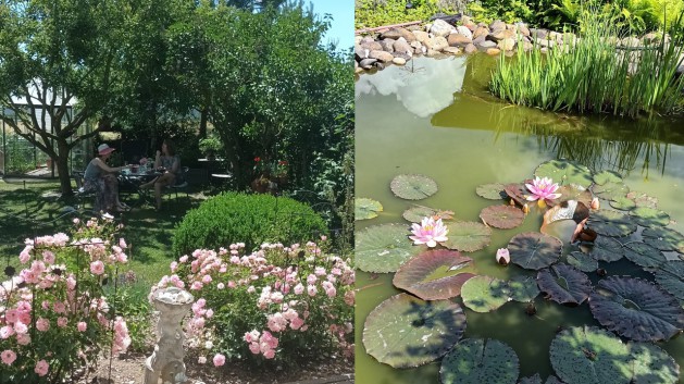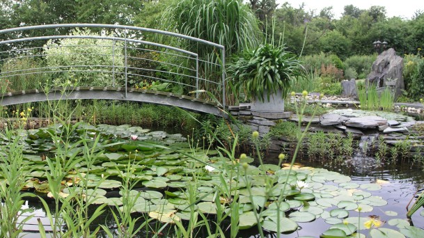 - Ein idyllischer Teich mit blühenden Wasserpflanzen bildet das Herzstück