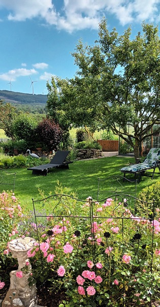 - Ein liebevoll angelegter Garten zum Wohlfühlen mit freiem Blick auf den Soonwald.