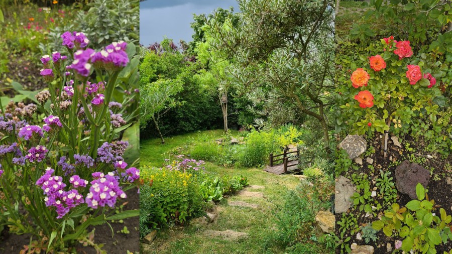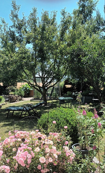 - Vorbei an bunter Ziergehölzhecke, Blumenrabatten, mediterranen Pflanzen und Obstbäumen flanieren