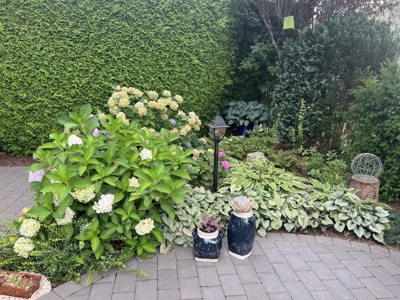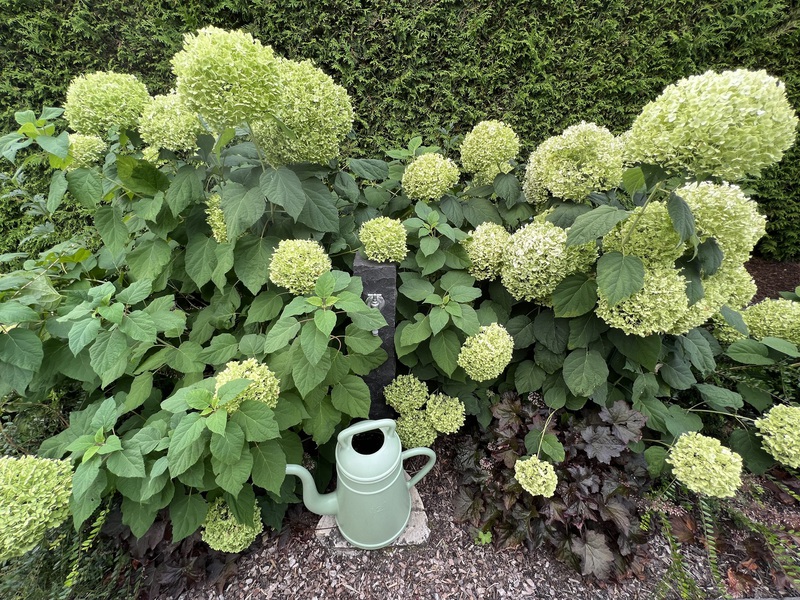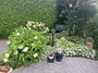 mit Rhododendren und Hortensien;