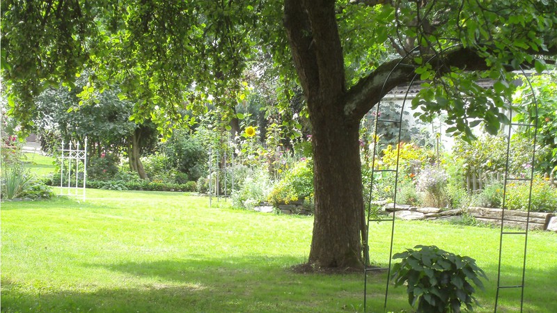 - Ein Kräuterbeet unter einem Apfelbaum