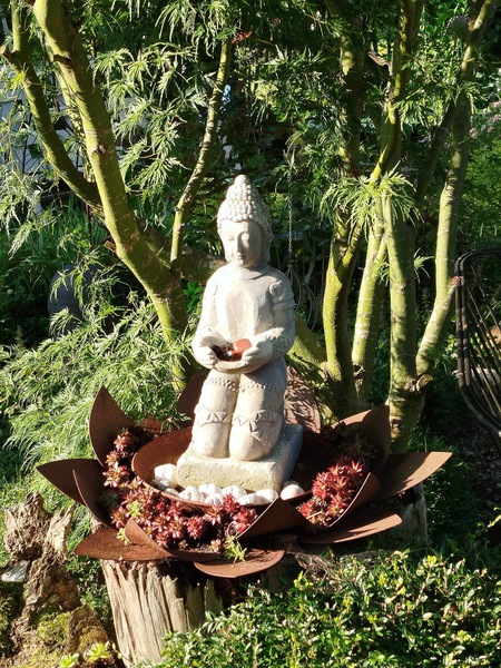 - Dekorative Accessoires liebevoll in Szene gesetzt, unterstreichen den romantischen Stil des Gartens.