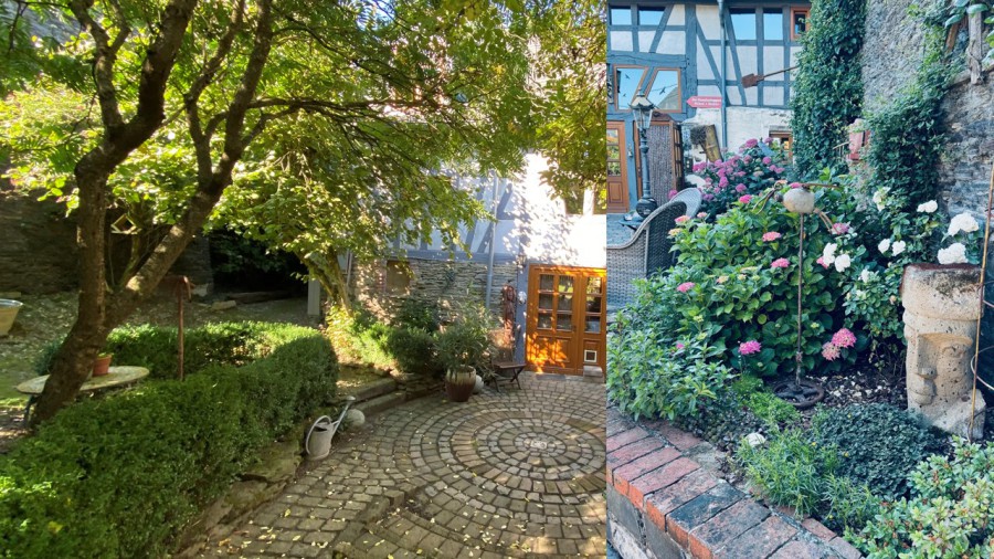- Der Garten liegt am Fuß der Burg Stahleck mit Blick über die historische Dachlandschaft von Bacharach. Er ist als